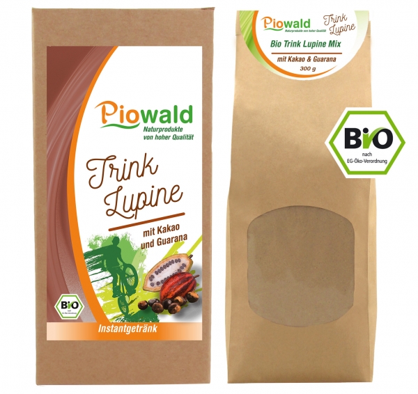 Bio Trink Lupine Mix mit Kakao und Guarana ist ein pflanzliches Instantgetränkepulver zum verrühren mit Wasser oder pflanzlichen Drinks wie Reis-, Soja-, Mandelmilch.